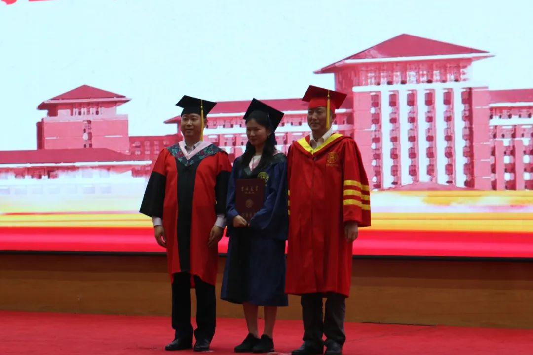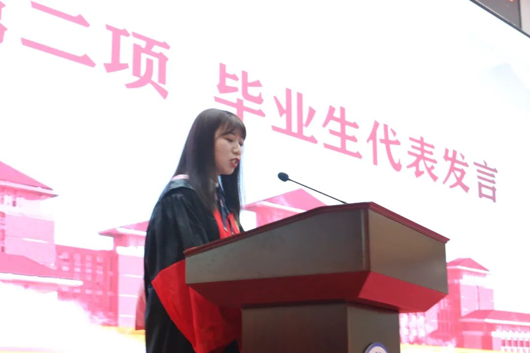 接着,由毕业生代表博士研究生康雯嘉发言。面对身边的同侪,毕业的同学们依依留恋;面对光彩的未来,毕业的同学们充满展望!我们不忘初心,我们继往开来,我们都有光明的前程。