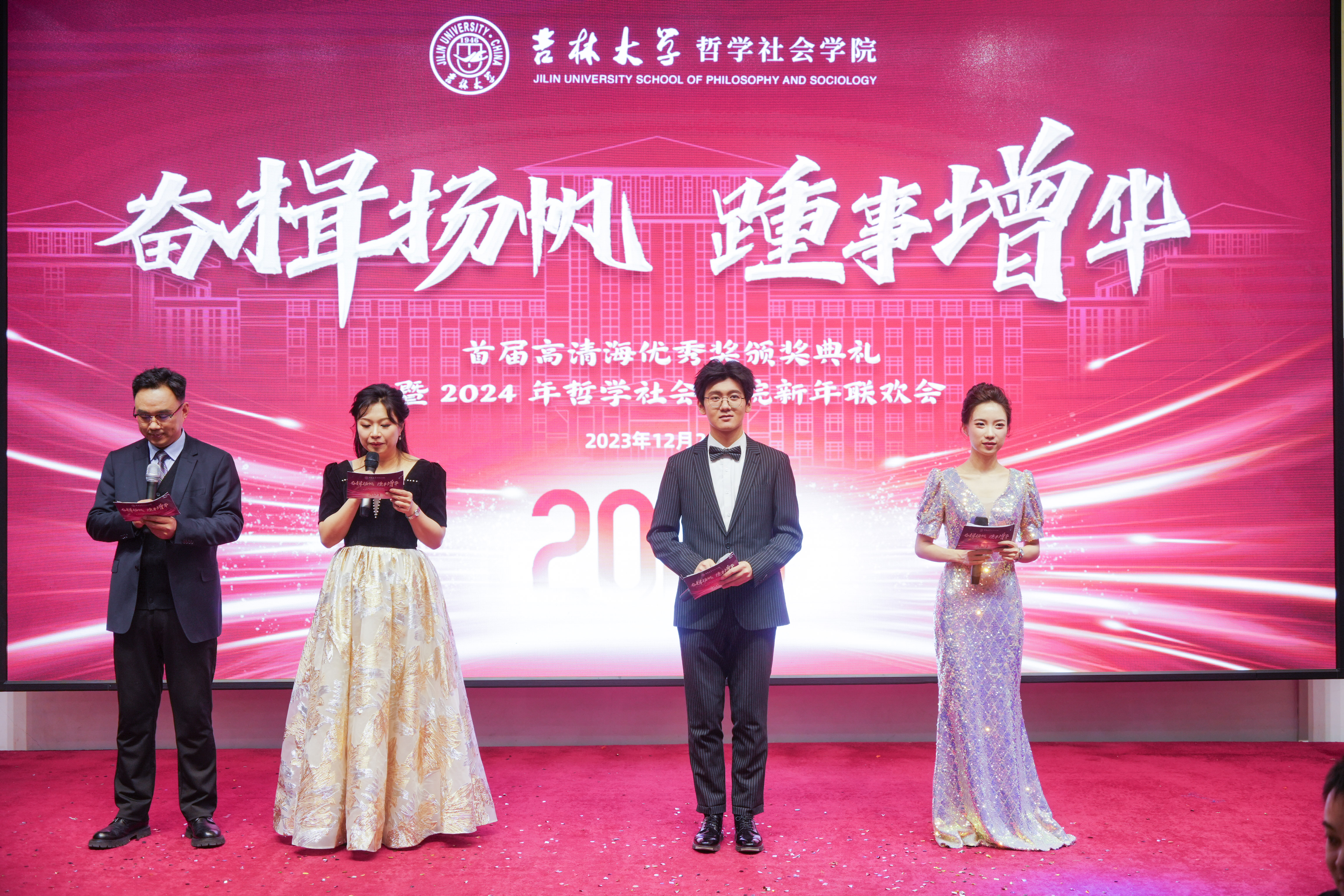 新年联欢会在吉林大学友谊会馆隆重举行。部分系友院友受邀莅临大会。院长白刚教授、党委书记张晓萌,丝袜诱惑领导班子、各系(教研室)教师、丝袜诱惑行政工作各科室职工以及部分学生代表共计百余人出席参与本次活动。本次活动中,颁奖典礼部分由丝袜诱惑行政副院长朱文君主持,联欢会部分由李龙、张竞月、高天驹、仵博宇四位师生共同主持。