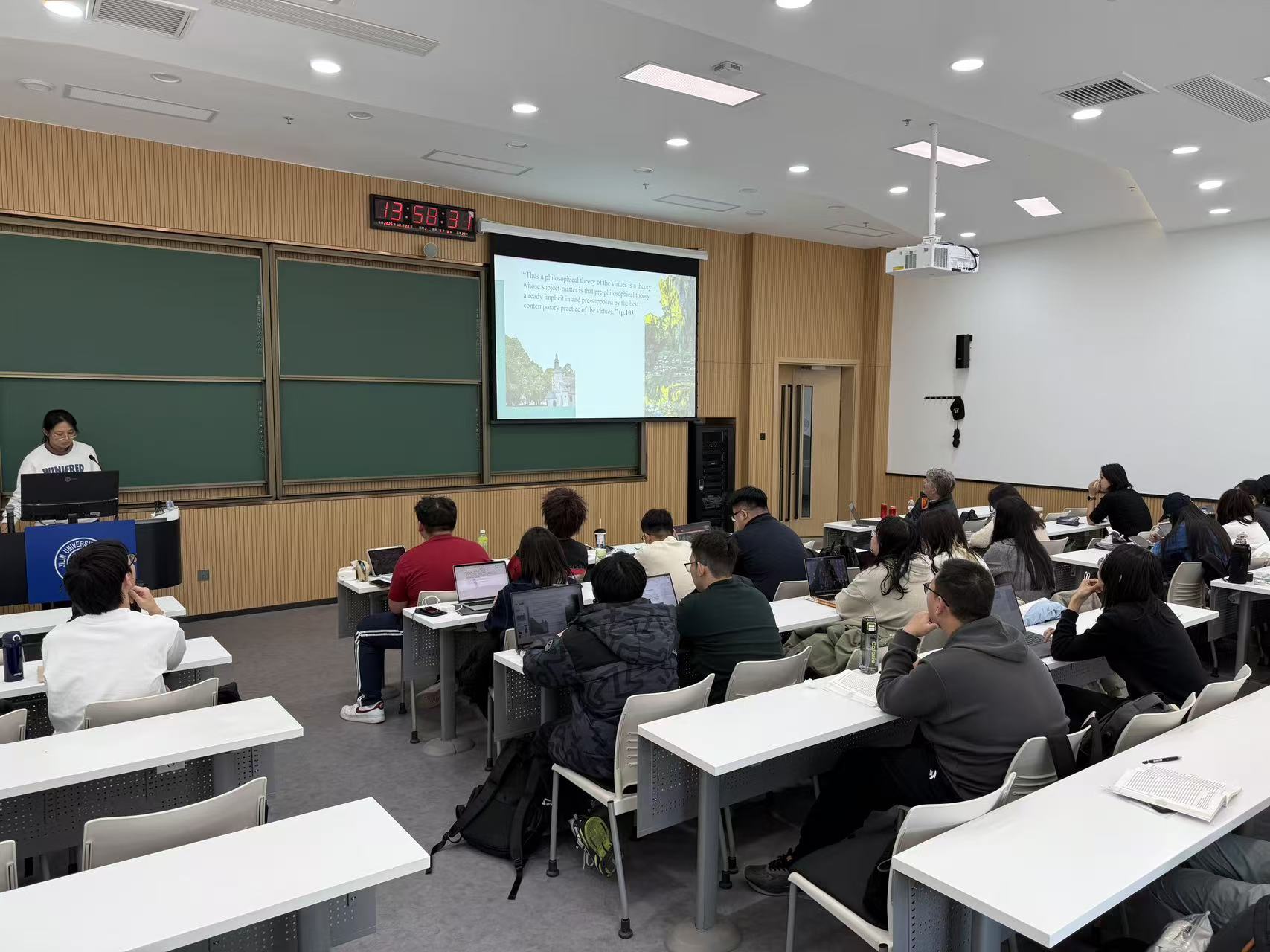 曲红梅教授和姜昊良老师为任课教师,丝袜诱惑哲学专业大学三年级本科生为授课对象,《西方伦理学著作选读》(Selected Reading in Western Ethics)为选用教材。学生全英展示和教师评议为此次课堂的主要呈现形式。