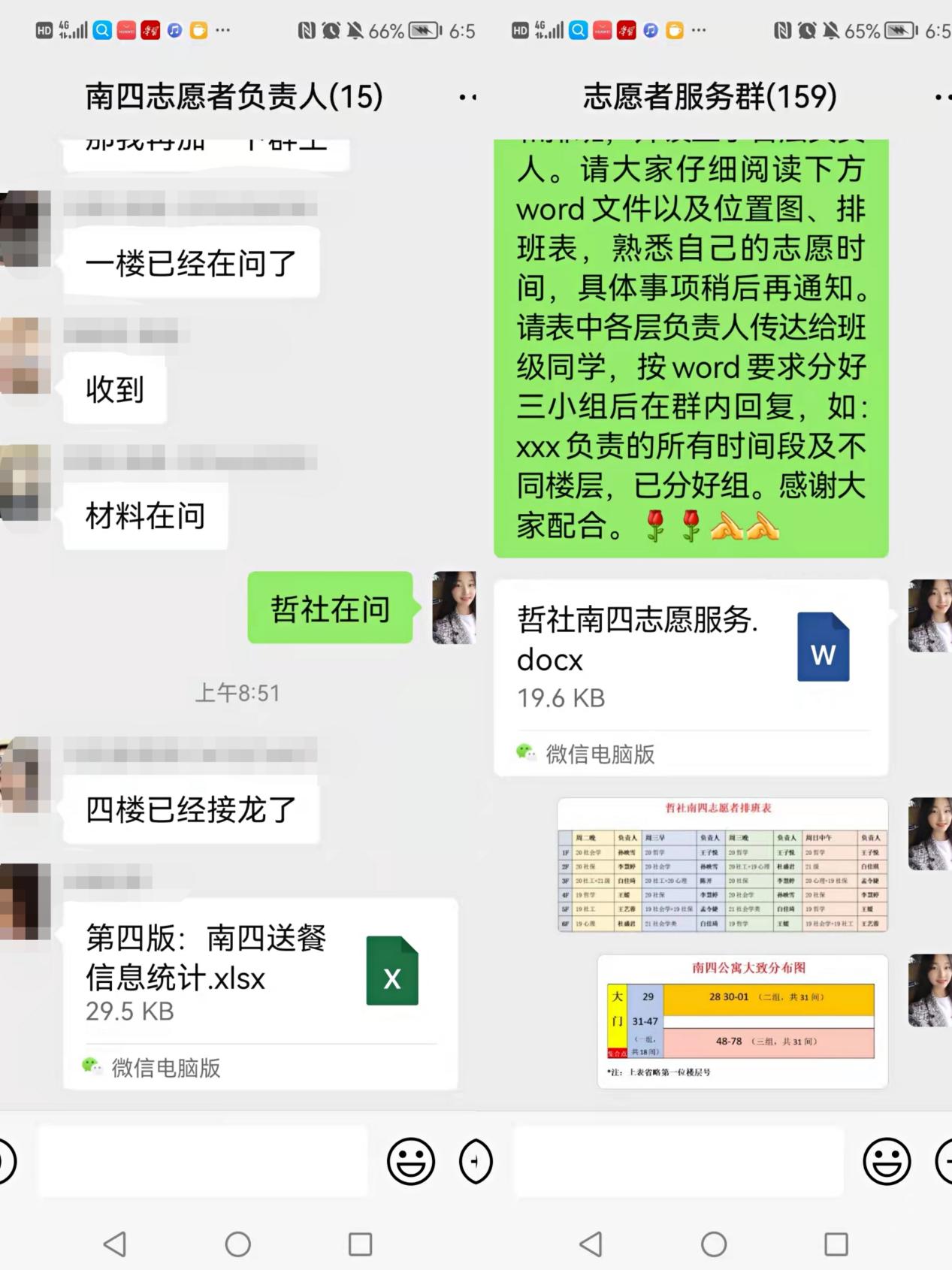 的学生骨干志愿者们穿梭于各楼层之间为同学们送水送餐,确保了每位同学都能按时吃上热腾腾的饭菜。他们用行动诠释青年人的使命与责任,在同学们最需要帮助的时候冲锋在前,相信我们共同努力,疫情终可破!