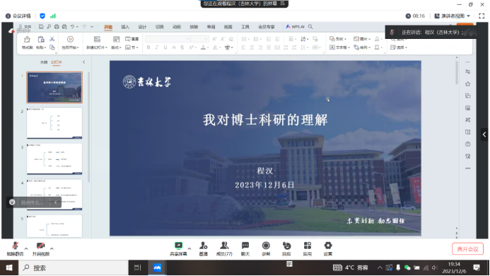 会上,主讲嘉宾们从自身经历出发,分享了科研过程中和读博期间的情绪调适方法,介绍了学术经验和压力缓解策略。程汉老师就听课、读书、讨论、写作“四位一体”的博士科研理念进行了解读,详细阐述了每个环节的方法及其重要性。
